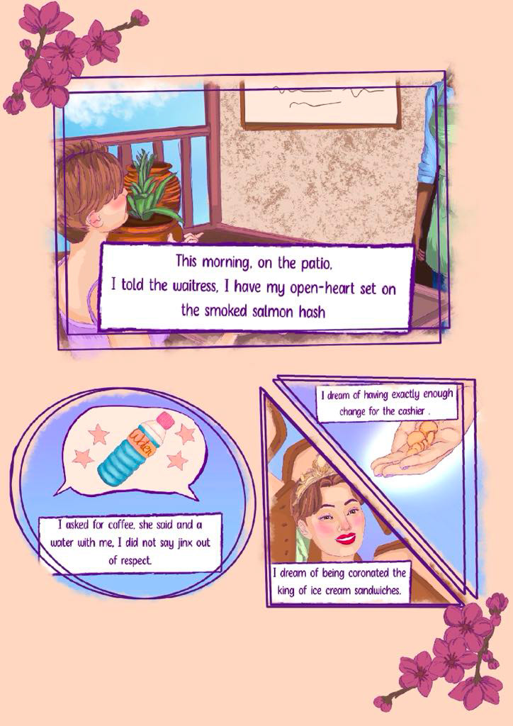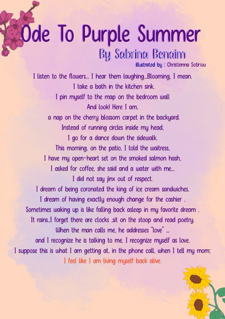 An illustration of Sabrina Benaims original poem "Ode to Purple Summer" from her poetry collection "I Love You, Call Me Back" (2021)